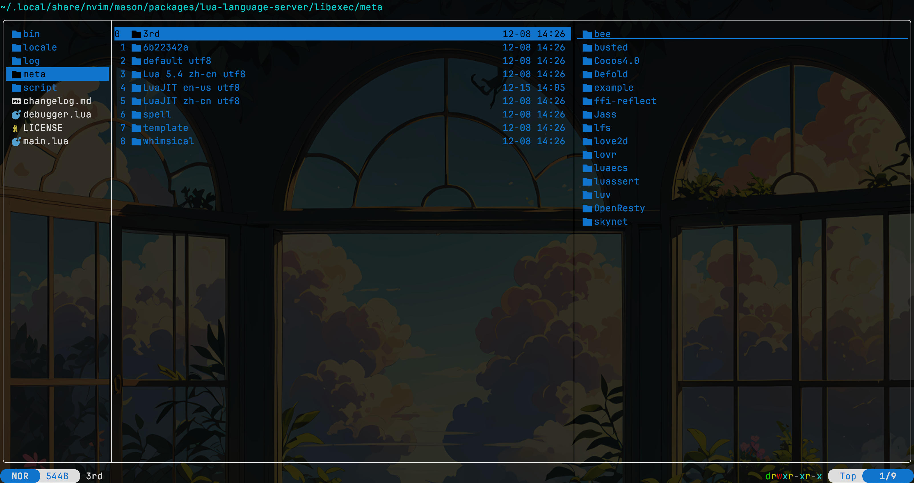 不过现在的配置还不够,如果你现在就去编写代码,会发现所有的 vim.uv 都没有补全。回顾我们在 lua-language-server 中的配置,我们添加了这样一个 library:${3rd}/luv/library。这其实是 lua-language-server 自己打包了一系列第三方的 meta 信息,可以在 ~/.local/share/nvim/mason/packages/lua-language-server/libexec/meta/3rd 下找到。然而,emmylua_ls 没有提供这些,所以就需要我们手动去搞一份这些 meta。
