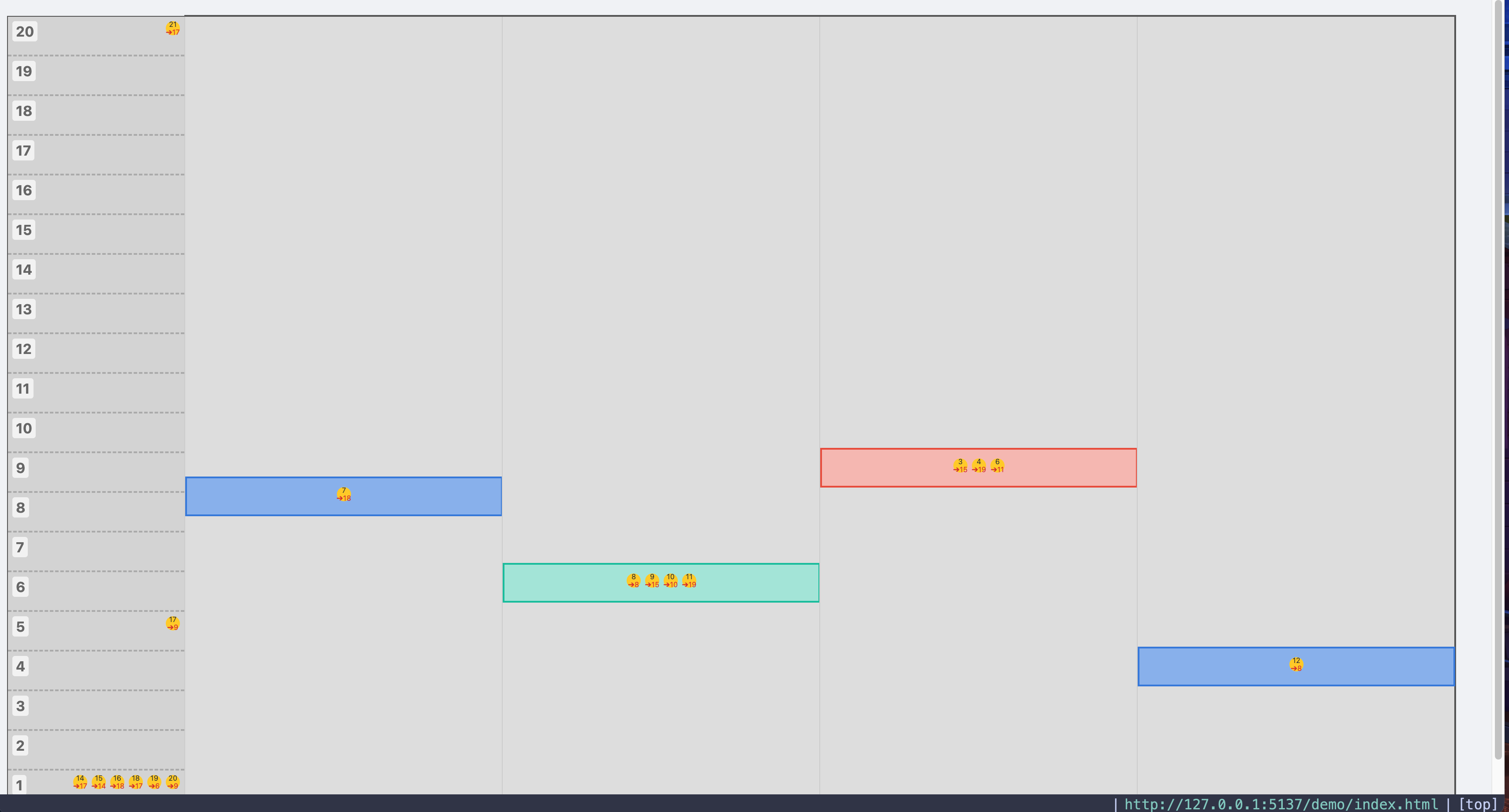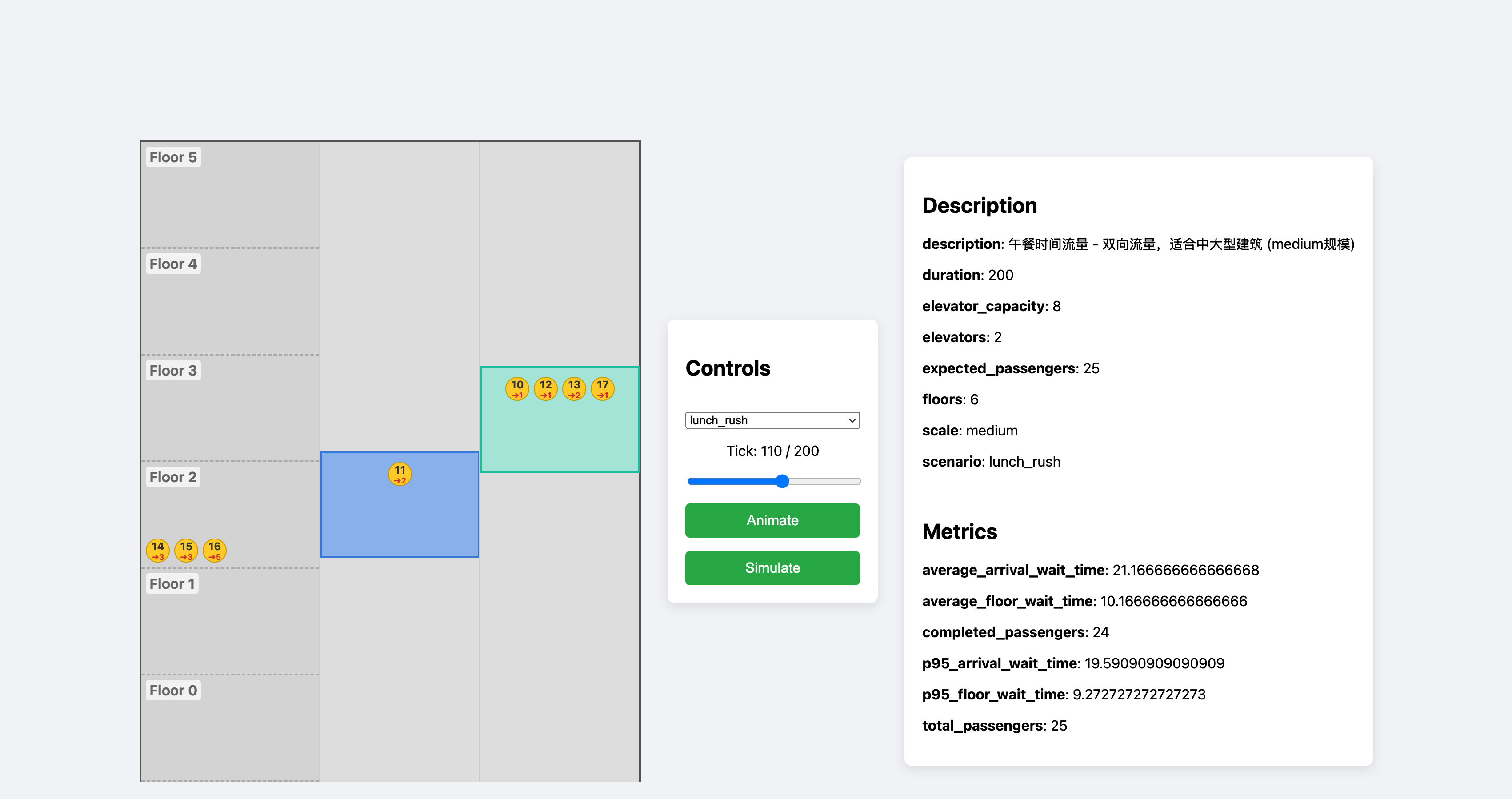 然而后来,我发现实际提交的作业并不是使用模拟器里提供的测试案例;此外,由于新的需求要求我不能自己启动模拟器,仅通过 http 请求拿不到电梯的具体位置,我只能在新版 gui 中设计了一套有点麻烦的计算电梯位置的方式,这种情况下继续支持滑动条查看每个 tick 电梯位置显然得不偿失;另外,测试案例中包含 4 台电梯和 20 层楼,出于 ui 设计的考虑我也没有办法在页面上呈现这么多信息。于是我把报告和滑动条这些部分都砍掉了。界面变成了这样: